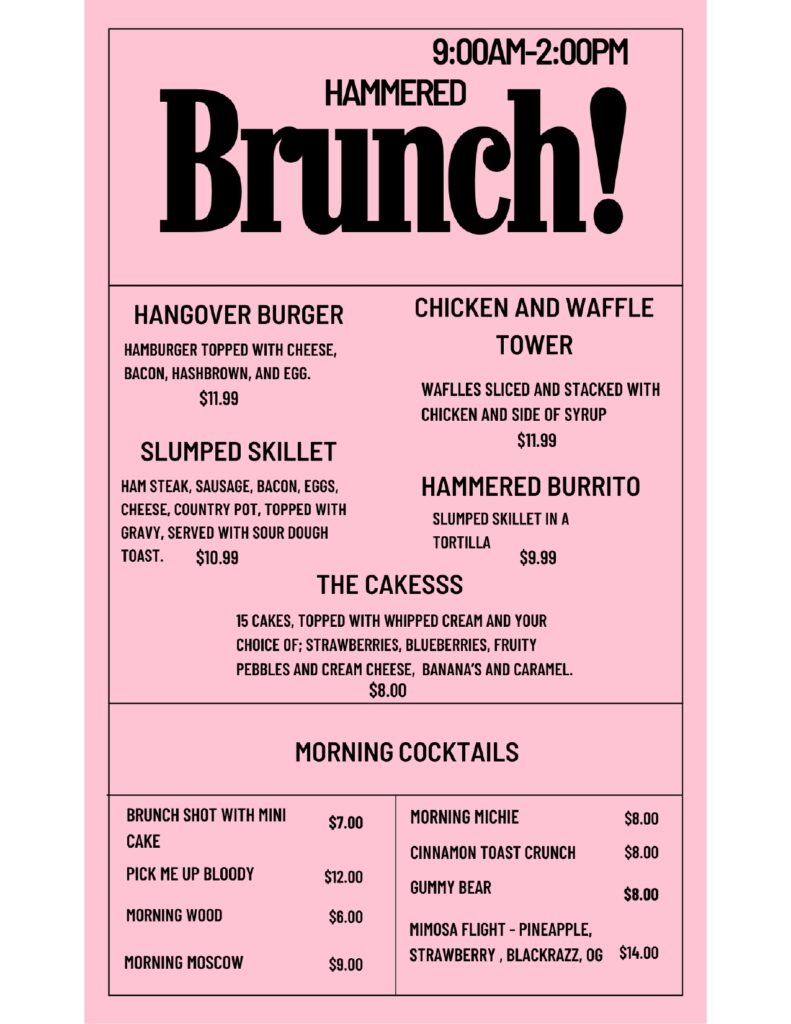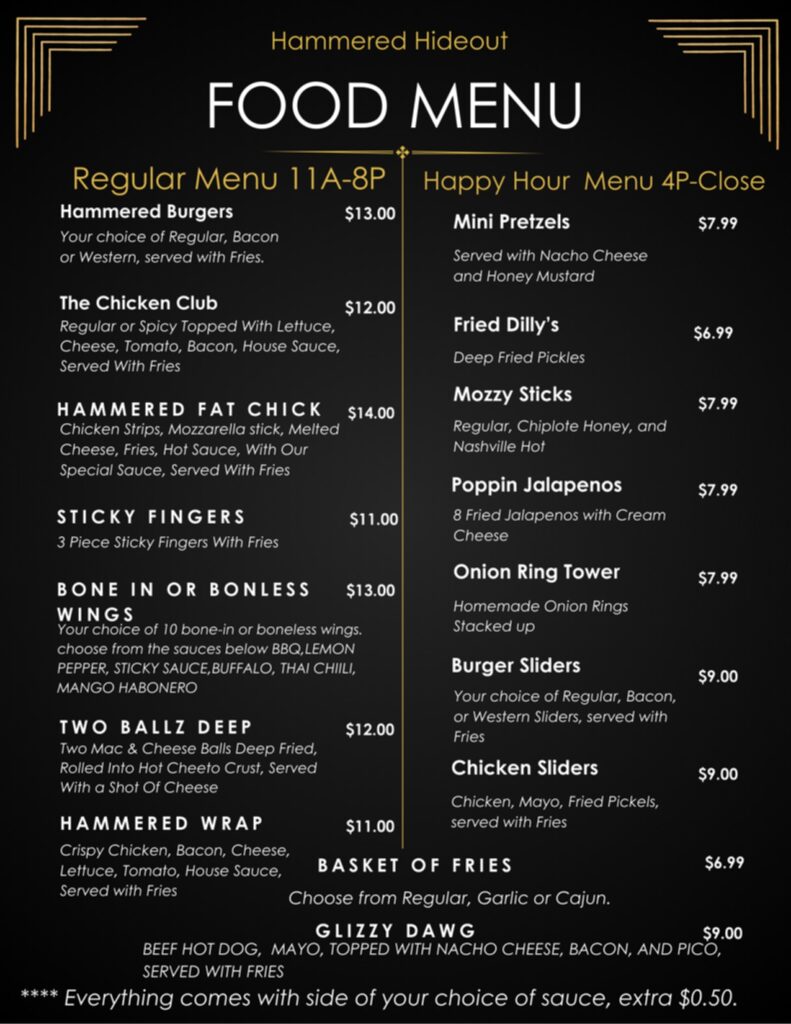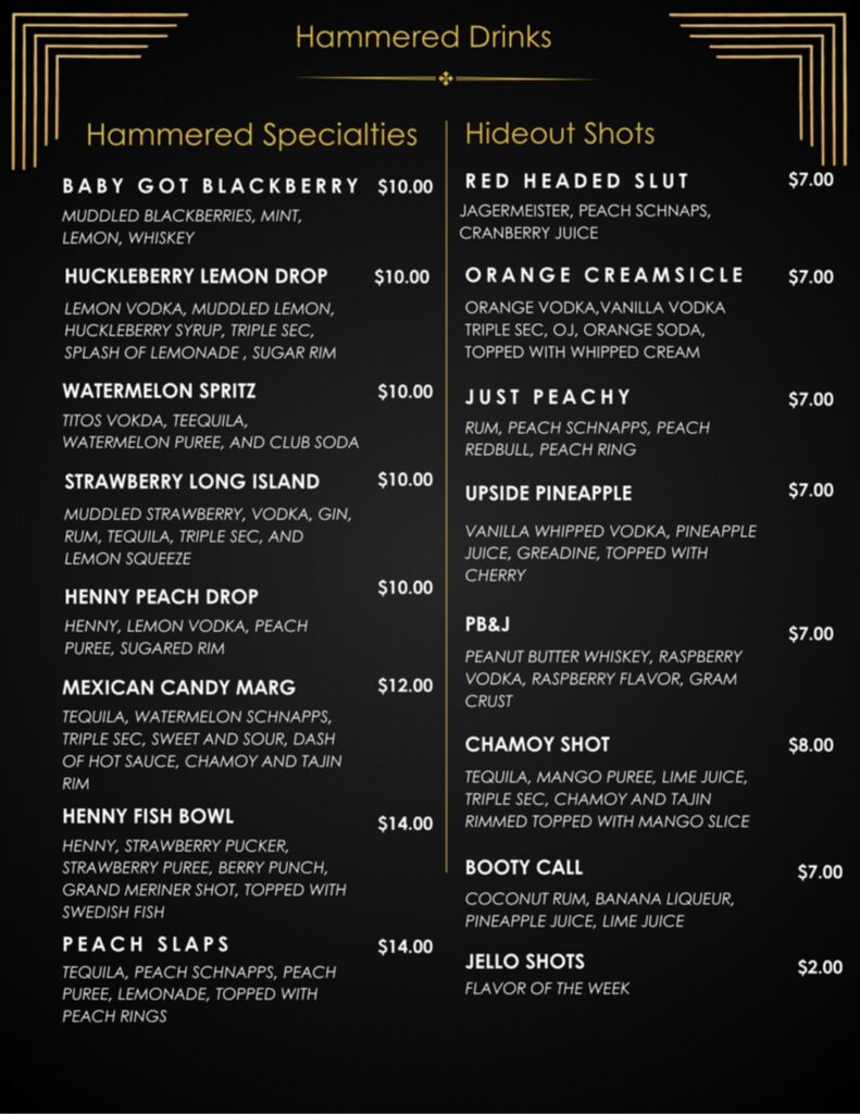 We offer a diverse range of experiences designed to elevate your night out. At The Hammered Hideout, we strive to create an atmosphere where every visit is a unique adventure waiting to unfold. Whether you’re looking to unwind with a refreshing drink, indulge in delectable cuisine, or engage in friendly competition with our selection of games, we have something for everyone. Our goal is to provide a dynamic and engaging environment where you can relax, socialize, and enjoy the company of friends old and new. Join us at The Hammered Hideout and let the evening take you on a journey of fun and excitement.